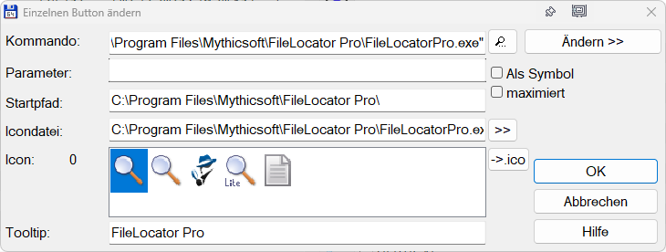 Laut https://help.mythicsoft.com/filelocatorpro/v9/en/index.html->Advanced Features->Command Line: (sorry bei der deutschen Übersetzung der Hilfe hat's mir die Fussnägel aus den Zehen gezogen..)